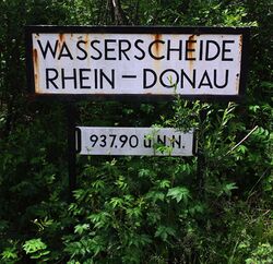Within the Alpine foothills it runs north of the Schussen catchment area of Lake Constance towards the sources of the Brigach and Breg headwaters of the Danube in the Black Forest. It then follows the main ridge of the Swabian and Franconian Jura with the crossing of the Rhine–Main–Danube Canal northeastwards up to the Fichtelgebirge and southeastwards along the Bohemian Forest, forming the border between Germany and the Austrian Mühlviertel and Waldviertel regions with the Czech Republic, where the large Bohemian basin is drained by the Elbe River.[8][9] It again turns northeastwards along the Bohemian-Moravian Highlands-Javořice Highlands to the Snieznik Mountains of the Eastern Sudetes at the border with Poland , where the triple point of the Orlice, Elbe (North Sea); Morava, Danube (Black Sea); and Eastern Neisse, Oder (Baltic Sea) is located at the peak of Trójmorski Wierch (Klepáč, Klappersteine, Three Seas Peak, 1144 m above sea level). At this point, the European Watershed connects to the North Sea-Baltic Sea Continental Divide.[10]