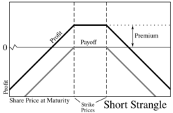 Short strangles have unlimited losses, and limited potential gains; however, they have a high probability of being profitable. The assumption of the short seller is neutral, in that the seller would hope that the trade would expire worthless in-between the two contracts, thereby receiving their maximum profit.[3][4] Short strangles are known to exhibit asymmetrical risk profiles, with larger possible maximum losses being observed compared than the maximum gains to the upside.[5]