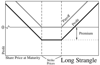 From Handwiki In finance, a strangle is an options strategy involving the purchase or sale of two options, allowing the holder to profit based on how much the price of the underlying security moves, with a neutral exposure to the direction of price movement. A strangle consists of one call and one put with the same expiry and underlying but different strike prices. Typically the call has a higher strike price than the put. If the put has a higher strike price instead, the position is sometimes called a guts.[1]