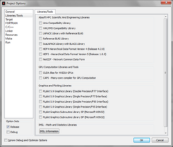All of these packages are included in the IDE and fully integrated into the compiler. Cost is included in purchase price except IMSL and GINO or Winteracter, which are sold separately. Installed packages can be selected for inclusion in a build by checkboxes on a tab on the Project Options menu as illustrated in the screen shot to the right. Some of these are detailed below.