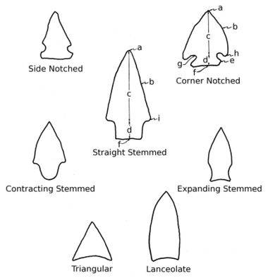 Projectile points fall into two general types: dart or javelin points and arrow points. Larger points were used to tip atlatl javelins or darts and spears. Arrow points are smaller and lighter than dart points, and were used to tip arrows. The question of how to distinguish an arrow point from a point used on a larger projectile is non-trivial. According to some investigators, the best indication is the width of the hafting area, which is thought to correlate to the width of the shaft.[4] An alternative approach is to distinguish arrow points by their necessarily smaller size (weight, length, thickness).[5]