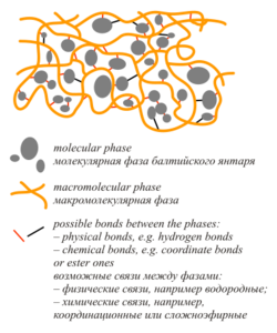 The structure of Baltic amber (succinite) is complex. It is not a polymer, because it is not composed of a repeating pattern of mers of the same type. Rather it has a macromolecular structure arranged in a crosslinked network, in which the pores (free spaces) are filled by components of molecular structure (e.g. by mono- and sesquiterpenes). Thus the chemical structure of the amber may be described as a supramolecule.[8] The structure makes the amber denser, harder and more resistant to external factors. It also makes possible good preservation of plant and animal inclusions.[9]