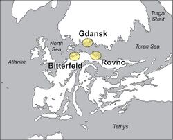 "Baltic amber" was formerly thought to include amber from the Bitterfeld brown coal mines in Saxony (Eastern Germany). Bitterfeld amber was previously believed to be only 20–22 million years old (Miocene), but a comparison of the animal inclusions in 2003 suggested that it was possibly Baltic amber that was redeposited in a Miocene deposit.[4] Further study of insect taxa in the ambers has shown Bitterfeld amber to be from the same forest as the Baltic amber forest, but separately deposited from a more southerly section, in a similar manner as Ukrainian Rovno amber.[5] Other sources of Baltic amber have been listed as coming from Poland and Russia.