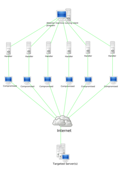 Stacheldraht botnet diagram showing a DDoS attack. (Note this is also an example of a type of client–server model of a botnet.)