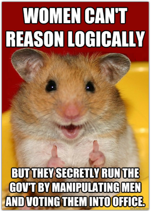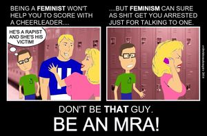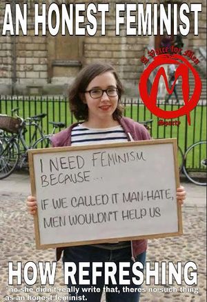 Misandry is hatred of males, which most MRAs purport is a characteristic of every feminist, especially feminazis, all females who don't succumb to clumsy attempts at seduction, and Western women at large. They have a few small points in the differences in treatment, but they are still idiotic little babies who won't shut up about how it's "not fair", ultimately becoming like the SJWs and "feminazis" they purport to oppose. Genuine misandry is rare and confined primarily to the most extreme divisions of radical feminism.