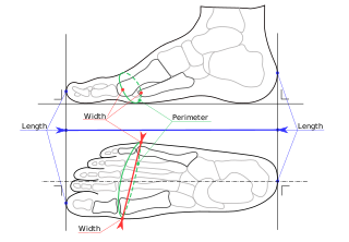The Mondopoint system is based on average foot length and foot width for which the shoe is suitable, measured in millimetres. The length of the foot is measured as horizontal distance between the perpendiculars in contact with the end of the most prominent toe and the most prominent part of the heel. The width of the foot is measured as horizontal distance between vertical lines in contact with the first and fifth metatarsophalangeal joints. The perimeter of the foot is the length of the foot circumference, measured with a flexible tape at the same points as foot width. The origin of the grade is zero.