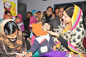 The pulse vaccination strategy is vaccinating a calculated proportion of an entire population in a single pulse.[1] It is a method used to eradicate an epidemic by repeatedly vaccinating a group at risk, over a defined age range, until the spread of the pathogen has been stopped. It is most commonly used during measles and polio epidemics to quickly stop the spread and contain the outbreak.[2][3]