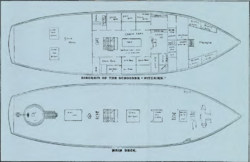 Pitcairn, as the schooner was named, had two masts, both about 80 feet (24 m) tall. The ship was about 100 feet (30 m) long and 27 feet (8.2 m) wide, with a depth of 10 feet (3.0 m). It had a net register tonnage of 115 tons. There were almost 1,600 yards (1,500 m) of sails, made in Chicago .[12] Pitcairn was initially rigged as a topsail schooner.[14] The hull was sheathed in copper to protect it from worms, and held fifty tons of slag as ballast. The forecastle had eight berths for a crew of up to twelve seamen. Beside this was the galley, and then the 11-by-24-foot (3.4 by 7.3 m) cabin, which held a bookcase and an organ besides the furniture. Six staterooms were provided for up to eighteen passengers. There were two toilet rooms and one bath room. There were two large water tanks in the aft of the vessel, which was otherwise left empty for cargo.[12]