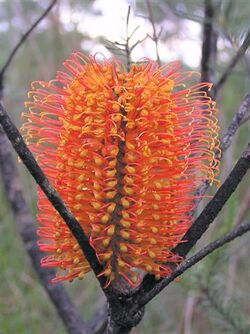 Banksia (in the traditional sense, not including Dryandra), is a genus of around 80 species in the plant family Proteaceae. An iconic Australia n wildflower and popular garden plant, they are easily recognised by their characteristic flower spikes and fruiting "cones". They grow in forms varying from prostrate woody shrubs to trees up to 35 metres tall, and occur in all but the most arid areas of Australia. As heavy producers of nectar, they are important sources of food for nectariferous animals such as honeyeaters and honey possums, and they are of economic importance to the nursery and cut flower industries. However they are threatened by a number of processes, including land clearing, frequent burning, and disease; and a number of species are rare and endangered.