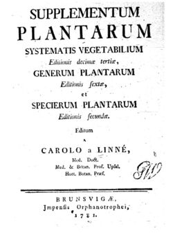The genus Banksia was finally described and named by Carolus Linnaeus the Younger in his April 1782 publication Supplementum Plantarum; hence the full name for the genus is "Banksia L.f.". Linnaeus placed the genus in class Tetrandra, order Monogynia of his father's classification,[3] and named it in honour of Banks. The name Banksia had in fact already been published in 1775 as Banksia J.R.Forst & G.Forst, referring to some New Zealand species that the Forsters had collected during Cook's second voyage. However Linnaeus incorrectly attributed the Forsters' specimens to the genus Passerina, and therefore considered the name Banksia available for use. By the time Joseph Gaertner corrected Banks' error in 1788, Banksia L.f. was widely known and accepted, so Gaertner renamed Banksia J.R.Forst & G.Forst to Pimelea, a name previously chosen for the genus by Banks and Solander.[2]