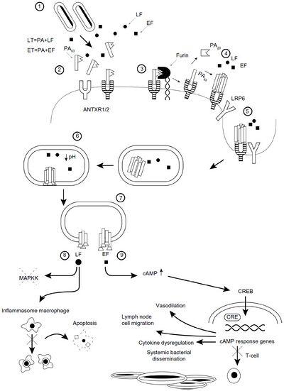 Throughout history, lethal factor was presumed to cause macrophages to make TNF-alpha and interleukin 1, beta . TNF-alpha is a cytokine whose primary role is to regulate immune cells, as well as to induce inflammation and apoptosis or programmed cell death. Interleukin 1, beta is another cytokine that also regulates inflammation and apoptosis. The overproduction of TNF-alpha and IL1B ultimately leads to septic shock and death. [43][46][47]
