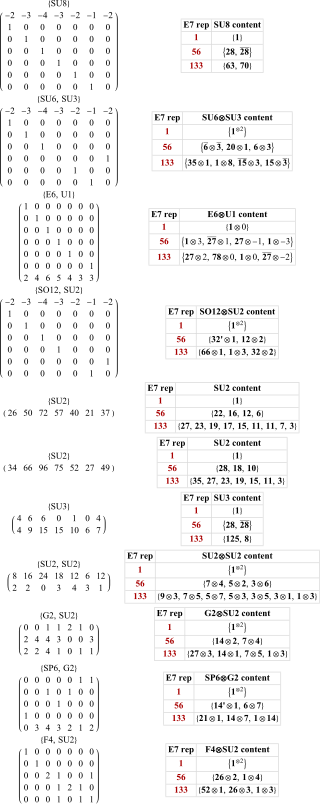 The embeddings of the maximal subgroups of E7 up to dimension 133 are shown to the right.