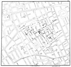 The practice of water treatment soon became mainstream and common, and the virtues of the system were made starkly apparent after the investigations of the physician John Snow during the 1854 Broad Street cholera outbreak. Snow was sceptical of the then-dominant miasma theory that stated that diseases were caused by noxious "bad airs". Although the germ theory of disease had not yet been developed, Snow's observations led him to discount the prevailing theory. His 1855 essay On the Mode of Communication of Cholera conclusively demonstrated the role of the water supply in spreading the cholera epidemic in Soho,[39][40] with the use of a dot distribution map and statistical proof to illustrate the connection between the quality of the water source and cholera cases. His data convinced the local council to disable the water pump, which promptly ended the outbreak.