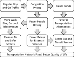 There is a consensus among economists that congestion pricing in crowded transportation networks makes the average citizen better off.[5] Economists disagree over how to set tolls, how to cover common costs, what to do with any excess revenues, whether and how "losers" from tolling previously free roads should be compensated, and whether to privatize highways.[6] Four general types of systems are in use: a cordon area around a city center, with charges for passing the cordon line; area wide congestion pricing, which charges for being inside an area; a city center toll ring, with toll collection surrounding the city; and corridor or single facility congestion pricing, where access to a lane or a facility is priced.