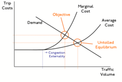 Cordon area congestion pricing is a fee or tax paid by users to enter a restricted area, usually within a city center, as part of a demand management strategy to relieve traffic congestion within that area.[25] The economic rationale for this pricing scheme is based on the externalities or social costs of road transport, such as air pollution, noise, traffic accidents, environmental and urban deterioration, and the extra costs and delays imposed by traffic congestion upon other drivers when additional users enter a congested road.[26]