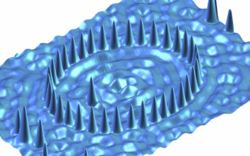 Several notable condensed matter physics experiments have been realized with atomic manipulation techniques. These include the demonstration of electron confinement in so-called quantum corrals by Michael F. Crommie et al.,[2] and the subsequent Quantum mirage experiment, where the Kondo signature of an adatom was reflected from one focus to another in an elliptical quantum corral.[3]