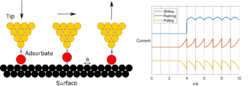 Depending on the tip apex and the surface/adsorbate system, the lateral motion can occur by pushing, pulling or sliding of the adsorbate. These modes result in distinct tunneling current signals during the lateral motion. For example, periodic steps in the tunneling current indicate that the adsorbate is “jumping” between adsorption sites while following the tip: this means the tip pushes or pulls the adsorbate.