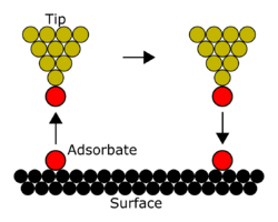 Lateral manipulation means moving an adsorbate on the surface by making a temporary chemical or physical bond between the STM tip and the adsorbate. A typical lateral manipulation sequence begins by positioning the tip close to the adsorbate, bringing the tip close to the surface by increasing the tunneling current setpoint, moving the tip along a desired route and finally retracting the tip to normal scanning height. Lateral manipulation is typically applied to strongly bound adsorbates, such as metal adatoms on metal surfaces. The probability that the surface adsorbate moves the same distance traveled by the tip is strongly dependent on the tip conditions.