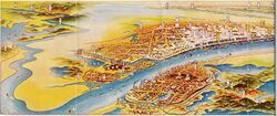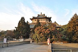 During the Han dynasty, Hanyang became a fairly busy port. The Battle of Xiakou in AD 203 and Battle of Jiangxia five years later were fought in the region over control of Jiangxia Commandery, territories of which included much of present-day eastern Hubei. In the winter of 208/9, one of the most famous battles in Chinese history and a central event in the Romance of the Three Kingdoms—the Battle of Red Cliffs—took place near the Yangtze River, with the cliffs near Wuhan identified as one of the potential locations.[38] Around that time, walls were built to protect Hanyang (AD 206) and Wuchang (AD 223). The latter event marks the foundation of Wuhan. In AD 223, the Yellow Crane Tower, one of the Four Great Towers of China, was constructed on the Wuchang side of the Yangtze River by order of Sun Quan, leader of the Eastern Wu. The tower become a sacred site of Taoism.[39]
