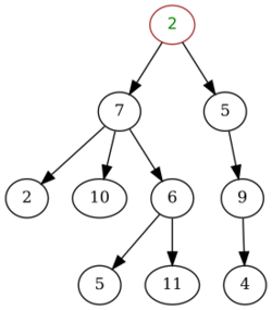 This unsorted tree has non-unique values (e.g., the value 2 existing in different nodes, not in a single node only) and is non-binary (only up to two children nodes per parent node in a binary tree). The root node at the top (with the value 2 here), has no parent as it is the highest in the tree hierarchy.