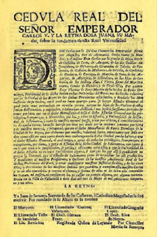 The Christian mission of the Indians and the increasing demand for skilled hands in the administration of the rapidly growing colonial empire made the Spanish colonists realize the need to offer a university education on soil in the Americas.[2] The foundation of a colonial university required, following the medieval tradition, either a papal bull (or papal brief) or a royal privilege granting the right to confer academic degrees to the students. Usually a bestowment from both clerical and secular authorities was sought and achieved.[3] Universities were all subjected to the king's supervision, only San Nicolas in Bogotá held the status of a private university.[4]