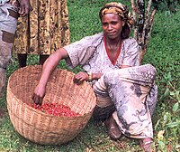 Ethiopian woman gathering coffee beans in a basket