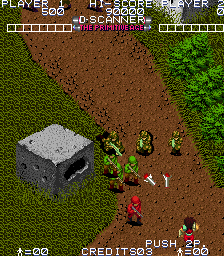 Time Soldiers can be played by either a single-player, or by two players simultaneously. Players move their characters with an eight-way rotary joystick, shooting enemies along a scrolling backdrop. The rotary joystick allows players to walk in one of eight directions while shooting in any of twelve directions. These controls are similar to the SNK-developed Ikari Warriors (1986)[3] which allowed the player to walk and rotate in eight directions.
