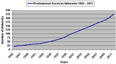 From Handwiki Professional services networks are networks of independent firms who come together to cost-effectively provide services to clients through an organized framework.[1] They are principally found in law and accounting. They may also be found in investment banking, insurance, real estate and architectural services.[2] Any profession that operates locally, but has clients in multiple locations, are potential members of a network. This entry focuses on accounting, legal, multidisciplinary and specialty practice networks. Today members of these networks employ more than one million professionals and staff and have cumulative annual revenues that exceed $200 billion.[3][4]