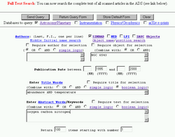 The search engine allows selection logic both within fields and between fields. Search terms in each field can be combined with OR, AND, simple logic or Boolean logic, and the user can specify which fields must be matched in the search results. This allows complex searches to be built; for example, the user could search for papers concerning NGC 6543 OR NGC 7009, with the paper titles containing (radius OR velocity) AND NOT (abundance OR temperature).