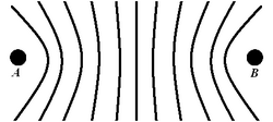 When plotted on a chart, the collection of possible locations for any given time difference forms a hyperbolic curve. The collection of curves for all possible measured delays forms a set of curved radiating lines, centred on the line between the two stations, known as the "baseline".[6] To take a fix, the receiver takes two measurements based on two different pairs of stations. The intersections of the two sets of curves normally results in two possible locations, equal distance on either side of the midpoint of the baseline. Using some other form of navigation, dead reckoning for instance, one can eliminate one of these possible positions, thus providing an exact fix.[1]