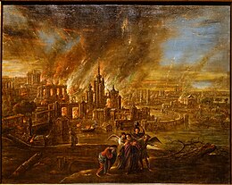 The provision of bread and water to the poor was also a capital offense (Yalḳ., Gen. 83). Two girls, one poor and the other rich, went to a well, and the former gave the latter her jug of water, receiving in return a vessel containing bread. When this became known, both were burned alive (ib.).[73] According to the Book of Jasher, Paltith, one of Lot's daughters, was burnt alive (in some versions, on a pyre) for giving a poor man bread.[74] Her cries went to the heavens.[69] Another woman was similarly executed in Admah for giving a traveler, who intended to leave the town the next day, water. When the scandal was revealed, the woman was stripped naked and covered with honey. This attracted bees as the woman was slowly stung to death. Her cries then went up into the heavens, the turning point that was revealed to have provoked God to enact judgement upon Sodom and Gomorrah in the first place in Genesis 18:20.[75][72] Lot's wife (who came from Sodom) had disapproved of her husband welcoming the strangers into their home; her asking for salt from neighbors had alerted the mob which came to Lot's door. As punishment she was turned into a pillar of salt.[76]