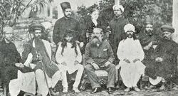 H. P. Blavatsky standing behind Henry Steel Olcott (middle, seated) and Damodar Mavalankar (seated to his left). Bombay, 1881
