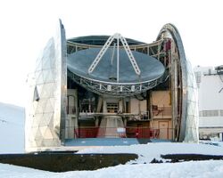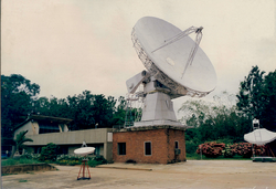 Another Leighton telescope was located in India at the Raman Research Institute. Although it followed the Leighton design fairly closely, it differs from all others because it was completely fabricated and assembled in India. It was also the only Leighton telescope which used prime focus receivers (in addition to receivers at the other foci). The telescope was placed atop a building which housed its IF system electronics and filter bank spectrometers. Operations began in 1988 with observations of SiO maser emission at 86 GHz from Mira-type variable stars.[8] In 1993 its surface accuracy was reported to be 120 microns RMS.[9] By 2009 the surface had degraded; holographic measurements at 12 GHz showed that the surface had a 350 micron RMS accuracy, but the surface still allowed observations at frequencies as high as 43 GHz with a 50% apperture efficiency.[10] The telescope was decommissioned around 2012.
