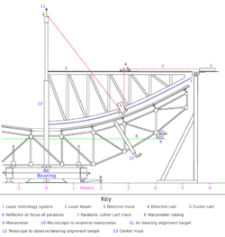 A unique feature of the Leighton telescopes is that the primary is fabricated as a single 10.4 m diameter precision surface, rather than individually machined panels. The dish panels are made of a light weight (15 kg/m3) aluminum honeycomb material with vertical channels. To produce the reflector's parabolic shape, the panels were assembled atop the same steel tube space frame that will support the panels on the deployed telescope. The space frame was mounted on an air bearing surrounding a central mast. An arm extended from the central mast, which had a parabolic track on the bottom side. The parabolic track was shaped by a laser metrology system that made use of the fact that a parabola is the locus of points equidistant from the focal point and a directrix line. The directrix in this case was the upper side of the arm. After the parabolic track was created, a cutting tool moved along the track, and cut the honeycomb panels as the dish rotated on the air bearing. After the honeycomb panels were cut to the proper parabolic shape, an aluminum skin was applied to each panel, to provide the dish's reflecting surface.[5]