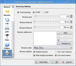 The KDEPrint framework for KDE contains various GUI tools that act as CUPS front ends and allows the administration of classes, print queues and print jobs; it includes a printer wizard to assist with adding new printers amongst other features.[41] KDEPrint first appeared in KDE 2.2.