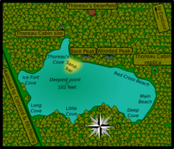 Thoreau felt a need to concentrate and work more on his writing. In 1845, Ellery Channing told Thoreau, "Go out upon that, build yourself a hut, & there begin the grand process of devouring yourself alive. I see no other alternative, no other hope for you."[51] Thus, on July 4, 1845, Thoreau embarked on a two-year experiment in simple living, moving to a small house he had built on land owned by Emerson in a second growth forest around the shores of Walden Pond, having had a request to build a hut on Flints Pond, near that of his friend Charles Stearns Wheeler, denied by the landowners due to the Fairhaven Bay incident.[52][53] The house was in "a pretty pasture and woodlot" of 14 acres (5.7 hectares) that Emerson had bought,[54] 1 1⁄2 miles (2.5 kilometers) from his family home.[55] Whilst there, he wrote his only extended piece of literary criticism, "Thomas Carlyle and His Works".[56]