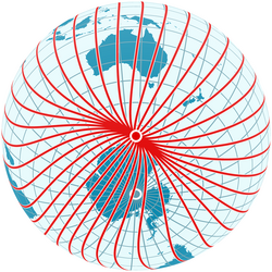 All meridians intersect lines of latitude[note 2] — called parallels — at right angles. When used together, meridians and parallels are the basis of the coordinate system used by geographers.