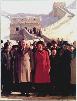 Relations between the United States and China after the Second World War had been paternalistic and relatively friendly.[11] However, relations fractured in 1949-1950 when the People's Republic of China was established on 1 October after peasant-backed Communists defeated the Nationalist government of Chiang Kai-shek.[12] The ideological tensions between the U.S. and the People's Republic of China were worsened by the Korean War and The First Taiwan Strait Crisis which saw America engage in battle against China and threaten nuclear attack. The Tibetan Uprising and China's first atomic test in 1964 would further strain US-PRC relations with the predominant American representation of China revolving around aggression, expansionism and extremism.[11] It was only when underlying Sino-Soviet tensions escalated in to the Sino-Soviet border conflict in 1969, and subsequent nuclear threats from Moscow, did China look to the U.S.[13][14] With a common enemy, the Soviet Union, China and the U.S. adjusted their policy toward each other and engaged in rapprochement in 1970.[15] Under Nixon, Henry Kissinger normalised U.S. and Chinese relations by connecting with high ranking Chinese officials; opening the US up to China.[16] Kissinger arranged a secret meeting in China in 1971 and Richard Nixon's 1972 visit to China.[17] The 1972 Summit between the U.S. and China opened communication, trade, and agreeance on certain principles of international conduct.[18]
