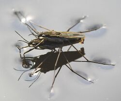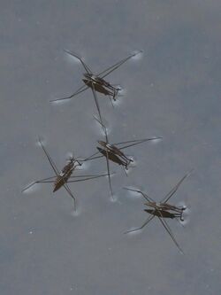 The Gerridae are a family of insects in the order Hemiptera, commonly known as water striders, water skeeters, water scooters, water bugs, pond skaters, water skippers, water gliders, water skimmers or puddle flies. Consistent with the classification of the Gerridae as true bugs (i.e., suborder Heteroptera), gerrids have mouthparts evolved for piercing and sucking, and distinguish themselves by having the unusual ability to walk on water, making them pleuston (surface-living) animals. They are anatomically built to transfer their weight to be able to run on top of the water's surface. As a result, one could likely find water striders present in any pond, river, or lake. Over 1,700 species of gerrids have been described, 10% of them being marine.[2]