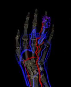 3D image of an arteriovenous malformation shown in purple on the ring finger of a hand