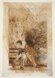 In the year 1792, Goya contracted an illness that left him permanently deaf; historians are unsure what the precise illness was that he suffered from, but it is speculated that Goya contracted either lead poisoning or “colic of Madrid” (a metal poisoning produced by cooking utensils), or some form of palsy. This illness caused him to suffer from an inability to balance on his feet, temporary blindness, and permanent deafness, which profoundly affected his life and his artistic style. In the years following his going deaf, Goya spent much of his time isolated from the outside world, as he asserted that he was unable to resume his work on large tapestry cartoons, and thus he turned to more personal projects.[11] During this time, he studied the events and philosophies of the French Revolution, and created a series of etchings portraying the inherent vices and cruelties of human nature in a more pessimistic and sardonic style for which he would later become known. This series of prints, namely Los Caprichos, were published in 1799 and depicted the confines of human reason, featuring whimsical and fantastical creatures that invade the mind during dreams, as displayed in 'The Sleep of Reason Produces Monsters' (El Sueño de la Razón Produce Monstruos).[9]