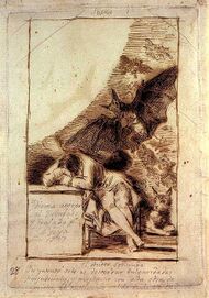 Of the 80 aquatints, number 43, "The Sleep of Reason Produces Monsters", can be viewed as Goya’s personal manifesto; many observers believe that Goya intended to depict himself asleep amidst his drawing tools, his reason dulled by slumber, bedeviled by creatures that prowl in the dark. Such creatures that appear in this work are often associated in Spanish folk tradition with mystery and evil; the owls surrounding Goya may be symbols of folly, and the swarming bats may symbolize ignorance. The title of the print, as marked on the front of the desk, is typically read as a proclamation of Goya’s adherence to the values of the Enlightenment: without reason, evil and corruption prevail.[5] Goya also included a caption for this print that may suggest a slightly different interpretation: "Imagination abandoned by reason produces impossible monsters; united with her, she is the mother of the arts and source of their wonders". This implies that Goya believed that imagination should never be completely renounced in favor of the strictly rational, as imagination (in combination with reason) is what produces works of artistic innovation.[2]