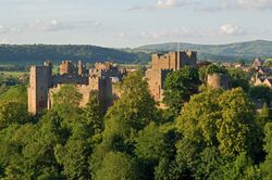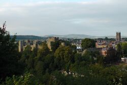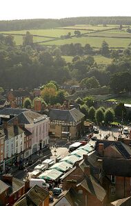 The oldest part is the medieval walled town, founded in the late 11th century after the Norman conquest of England. It is centred on a small hill which lies on the eastern bank of a bend of the River Teme. Situated on this hill are Ludlow Castle and the parish church, St Laurence's, the largest in the county.[2] From there the streets slope downward to the rivers Corve and Teme, to the north and south respectively. The town is in a sheltered spot beneath Mortimer Forest and the Clee Hills, which are clearly visible from the town.[3]
