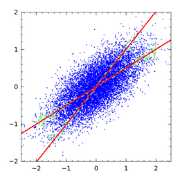 Illustration of regression dilution (or attenuation bias) by a range of regression estimates in errors-in-variables models. Two regression lines (red) bound the range of linear regression possibilities. The shallow slope is obtained when the independent variable (or predictor) is on the abscissa (x-axis). The steeper slope is obtained when the independent variable is on the ordinate (y-axis). By convention, with the independent variable on the x-axis, the shallower slope is obtained. Green reference lines are averages within arbitrary bins along each axis. Note that the steeper green and red regression estimates are more consistent with smaller errors in the y-axis variable.
