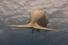 The tail fluke of a dugong is notched and similar to those of dolphins, whereas the tail fluke of manatees is paddle-shaped.[18]:89–100 The fluke is moved up and down in long strokes to move the animal forward, or twisted to turn. The forelimbs are paddle-like flippers that aid in turning and slowing.[17][18]:250 Manatees generally glide at speeds of 8 kilometres per hour (5 mph), but can reach speeds of 24 kilometres per hour (15 mph) in short bursts.[71] The body is fusiform to reduce drag in the water. Like cetaceans, the hind limbs are internal and vestigial. The snout is angled downwards to aid in bottom-feeding.[72] Sirenians typically make two- to three-minute dives,[73] but manatees can hold their breath for up to 15 minutes while resting[71] and dugongs up to six minutes. They may stand on their tail to hold their head above water.[74]