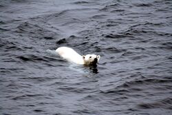 Polar bears can swim long distances at sea and can dive for short periods. Researchers tracked polar bears with GPS system collarsand recorded long-distance swims up to 354 kilometres (220 mi), with an average of 155 kilometres (96 mi), taking up to ten days.[88] A polar bear may swim underwater for up to three minutes to approach seals on shore or on ice floes while hunting.[89][90]