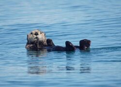 The sea otter hunts in short dives, often to the sea floor. Although it can hold its breath for up to five minutes,[80] its dives typically last about one minute and not more than four.[81] It is the only marine animal capable of lifting and turning over rocks, which it often does with its front paws when searching for prey.[82] The sea otter may also pluck snails and other organisms from kelp and dig deep into underwater mud for clams.[82] It is the only marine mammal that catches fish with its forepaws rather than with its teeth.[83]