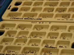 A selection of Mayfield and Drake aneurysm clips ready for implantation.