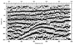 Claerbout (1968) developed a workflow to apply existing interferometry techniques to investigating the shallow subsurface, although it was not proven until later that seismic interferometry could be applied to real world media.[1][6] The long term average of random ultrasound waves can reconstruct the impulse response between two points on an aluminum block. However, they had assumed random diffuse noise, limiting interferometry in real world conditions. In a similar case, it was shown that the expressions for uncorrelated noise sources reduce to a single crosscorrelation of observations at two receivers. The interferometric impulse response of the subsurface can be reconstructed using only an extended record of background noise, initially only for the surface and direct wave arrivals.[7][8]
