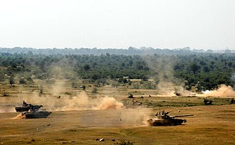 Militarily, India is the strongest country in South Asia. The Indian military is the third-largest in the world in terms of military personnel, and the Indian Army is the second largest standing army. The Indian Navy is the fifth largest navy,[16] and the Air Force is the fourth largest air force globally.[17] Historically, the Indian military heavily relied upon Soviet arms and technical assistance, although it continuously developed indigenous technology. Since the collapse of the Soviet Union, India has built most modern military technologies domestically or in collaboration with foreign countries. The Indian Air Force maintains approximately 1300 combat and non-combat aircraft,[18] the Indian Army maintains nearly 5000 main battle tanks,[19] and the Indian Navy employs 155 vessels,[20] including one aircraft carrier. Six nuclear-powered submarines are under construction, and the Navy is undergoing rapid modernization and expansion. Aircraft of the Indian Air Force include the 4.5 generation fighter Sukhoi Su-30MKI, which is IAF's primary air superiority aircraft. India is a de facto nuclear power. At present, India possesses two intermediate-range ballistic missiles: Agni II with a range of 2,000–2,500 km and Agni III with a range of 3,500 km. India is developing an intercontinental ballistic missile named Surya.[21]